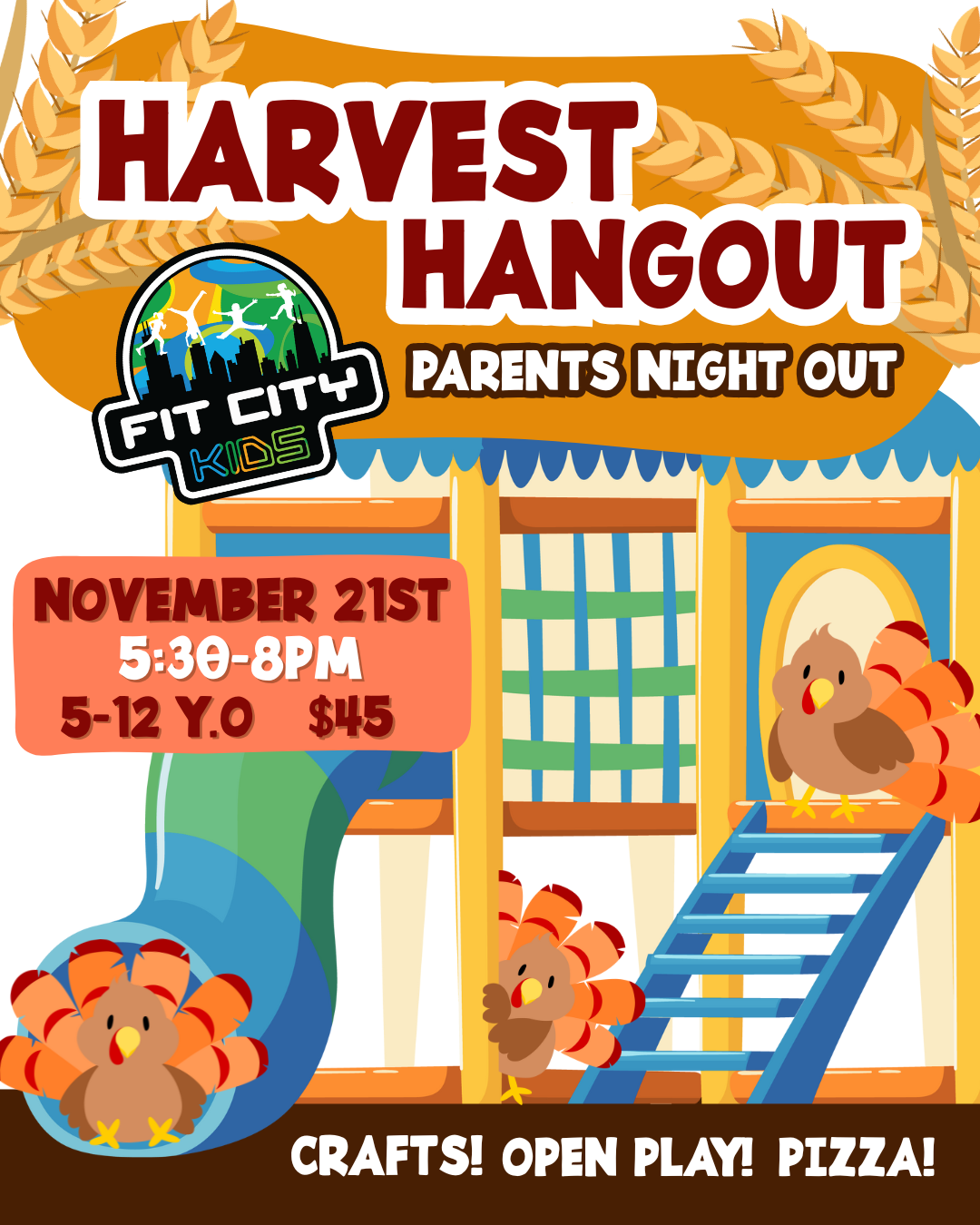 Join us for a fun-filled evening at Fit City Kids for our Harvest Hangout – Parents Night Out! Drop the kids off for an exciting night of open play, organized games, crafts and pizza while you enjoy some time to yourself.