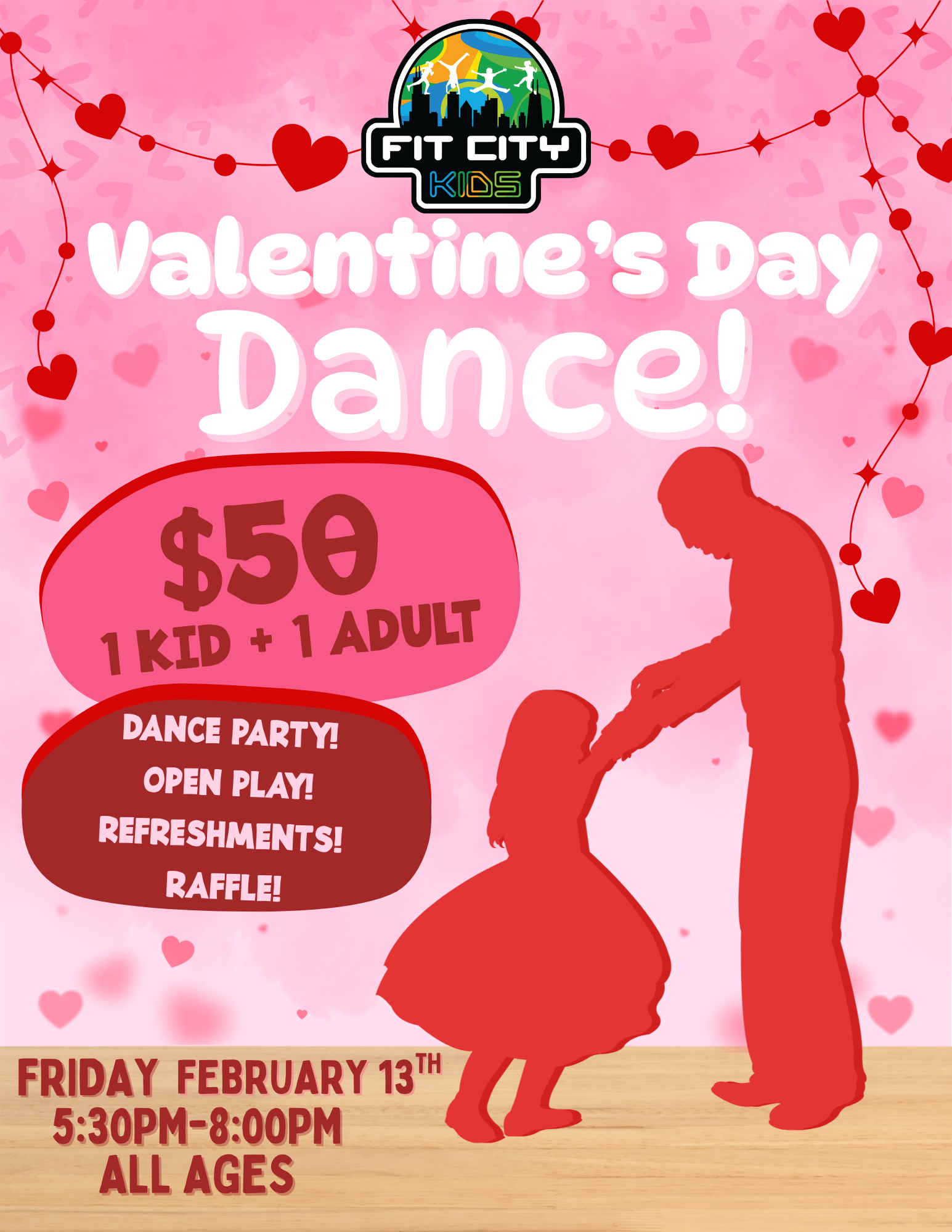 Enjoy a lively dance party, open play, festive refreshments, and a raffle with exciting prizes. Dress up, dance it out, and celebrate love, laughter, and movement in a playful Fit City Kids environment.